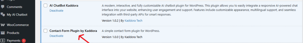 • After sucessfully installation of plugin, you will see ‘ContactForm-Kaddora’ in your installed plugin section, here you can check version and description about the plugin.